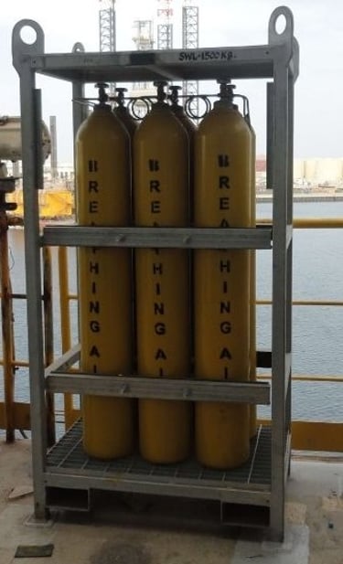 Valkyrie fabricate and supply high-pressure BA cylinder racks assembled in a cascade configuration to ensure uninterrupted breathing air availability. Multiple cylinders are connected in sequence, allowing operators to switch between cylinders or banks to maintain continuous air supply. The rack is built with a heavy-duty frame for safe storage, transport, and field deployment.